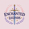 Logo for Enchanted Legends featuring a sword with a gold hilt and purple handle, surrounded by purple and pink laurel branches, gold stars, and the words 'Enchanted Legends' in bold blue letters.
